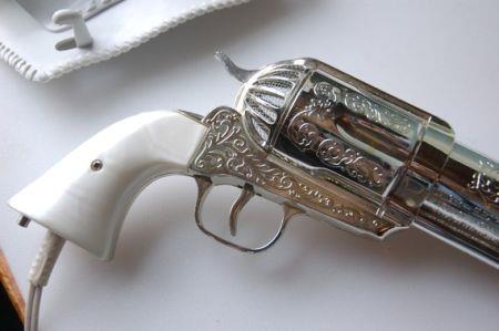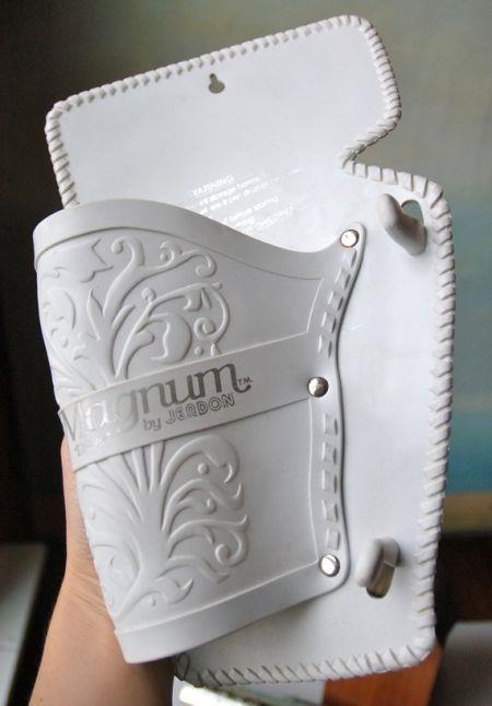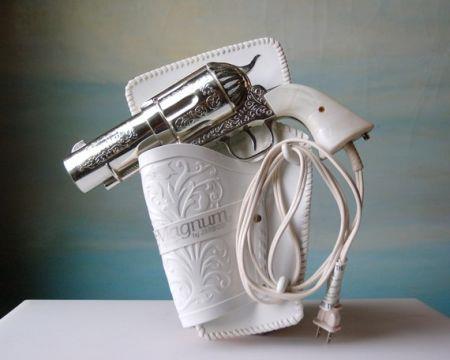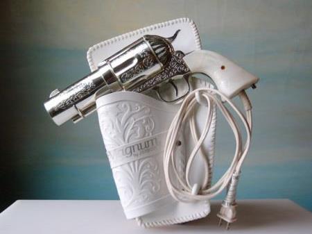 这把精美的复古手枪其实是一个吹风机。顶部的保险栓用来设定风档,扳机则是使用开关。此外,这把吹风机从枪体到枪套均由塑料制成,安全绝缘,让您可以放心使用。