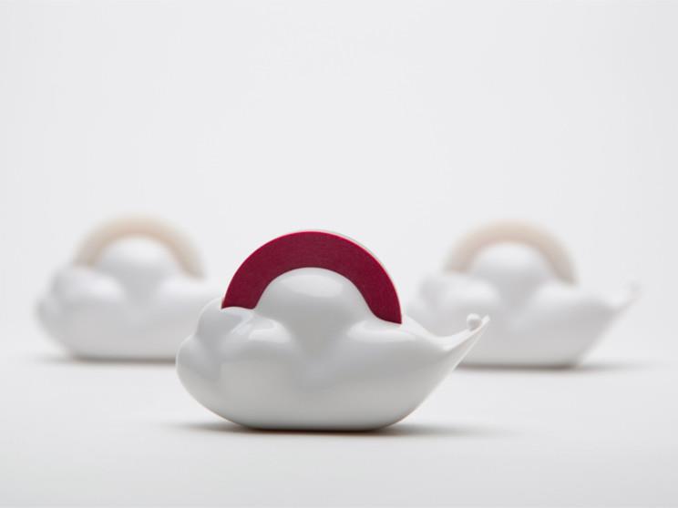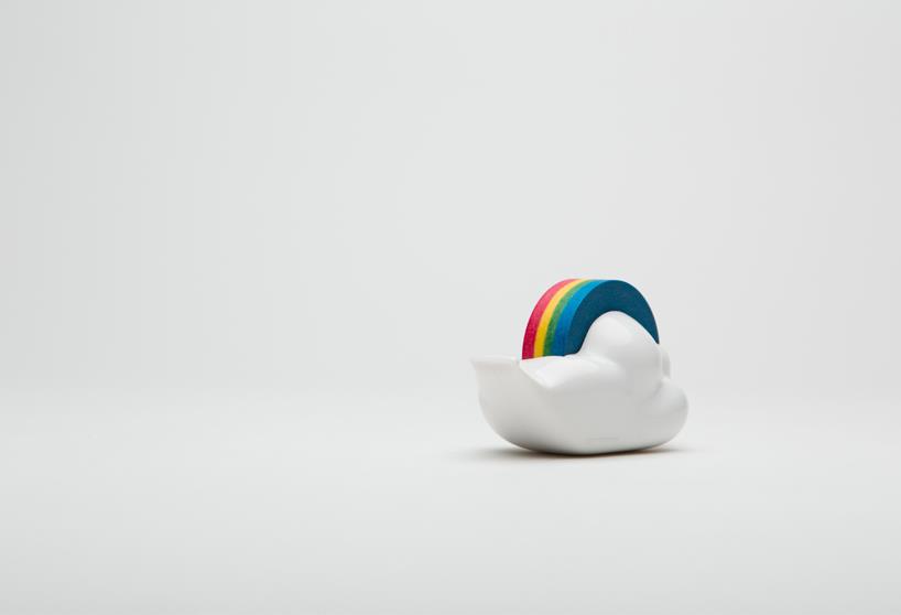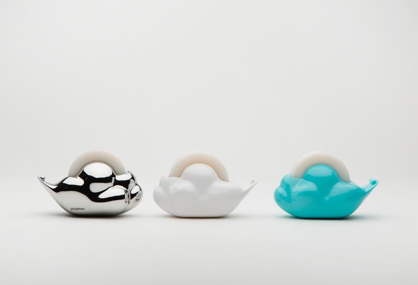 韩国设计事务所studio gongdreen设计的“快乐的云形胶带座”让使用者在繁忙的都市或办公室空间中还可以与大自然有所联系。这种胶带座采用白云的形状,内置胶带被设计成色彩缤纷的彩虹,使用的时候彩虹胶带就在白云上转动。这个设计使用可循环ABS塑料制作的,有白色、天蓝色和镀铬三种选择。